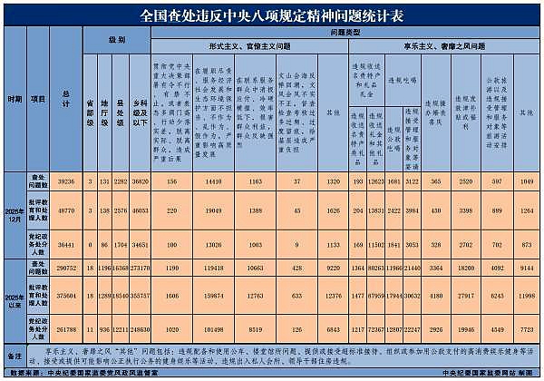 1月28日,中央纪委国家监委公布了2025年12月全国查处违反中央八项规定精神问题汇总情况。当月,全国共查处违反中央八项规定精神问题39236起,批评教育和处理48770人,其中党纪政务处分364...