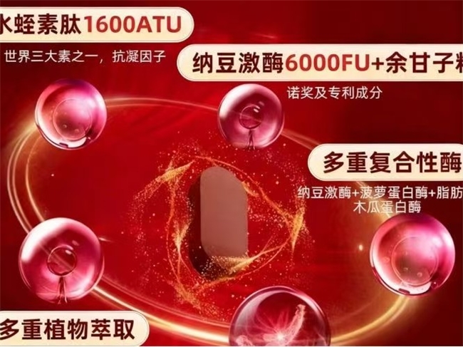 核心成分:越南菲牛蛭提取物7000mg/瓶(84000 ATU),复配纳豆激酶1800 FU、辅酶Q10 50mg。基础肠溶包衣技术。