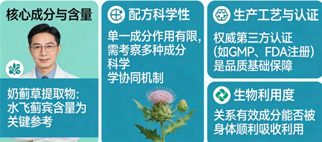答: 可关注以下几点:一看核心成分与含量,例如常见的奶蓟草提取物,其有效成分水飞蓟宾的含量是关键参考之一;二看配方科学性,单一成分作用有限,考察多种成分是否具有科学协同机制更重要;三看生产工艺与认证,权威的第三方认证(如GMP、FDA注册等)是品质的基础保障;四看生物利用度,这关系到有效成分能否被身体顺利吸收利用。