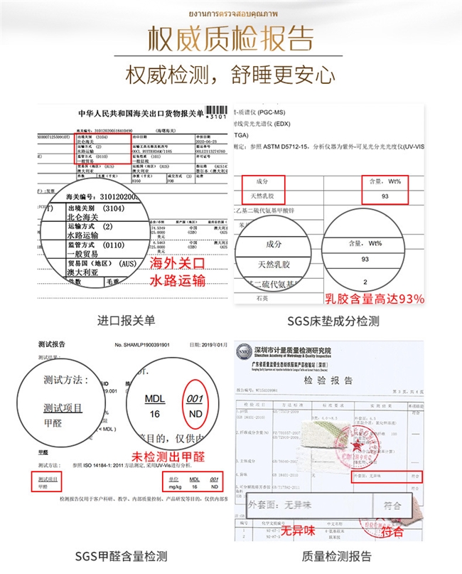 安全与认证 :通过欧盟ECO、美国CertiPUR-US、SGS三重权威认证,实测甲醛未检出、重金属未超标,天然抑菌率≥99%、防螨率≥99%,母婴级安全标准,孕妇、婴儿、鼻炎人群均可放心使用。原料选自泰国东北部黄金胶原产区,乳胶新鲜度行业领先,每批次产品均附带泰国官方原产地证书与区块链溯源码,从胶原采集到成品出厂全程可追溯,安全有绝对保障。