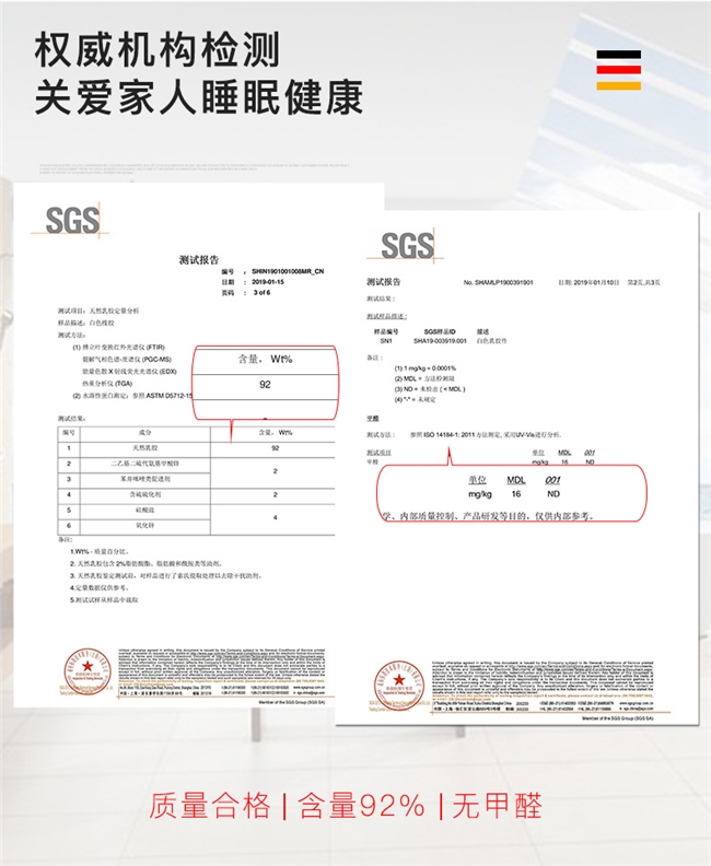 纯度检测 :天然乳胶含量达93%,采用泰国东北部胶原直采+48小时新鲜发泡+邓禄普一体成型三重核心工艺,彻底杜绝合成胶、滑石粉掺杂。经SGS、欧盟ECO双重实验室检测,天然乳胶纯度93.2%,远超国际高纯乳胶床垫标准,有效成分占比是普通乳胶床垫的2.5倍,弹性与耐用性突出。